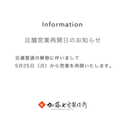 休業要請解除に伴いまして、4月16日から長らく休業しておりました店舗と体験講座受付を5月25日より再開する運びとなりました。