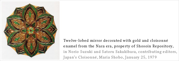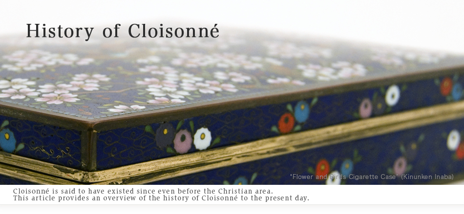 Cloisonné’s origins are quite ancient, dating back to more than three thousand years ago to the age characterized by King Tutankhamen’s golden mask. This art subsequently spread throughout Europe, and reached Japan in the sixth and seventh century via China and Korea. The oldest example of cloisonné in Japan is a mirror, the back of which is enameled with cloisonné. This mirror is now in the collection of the Shosoin, the repository of Imperial treasures in Nara.