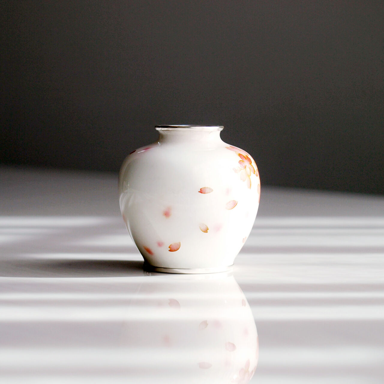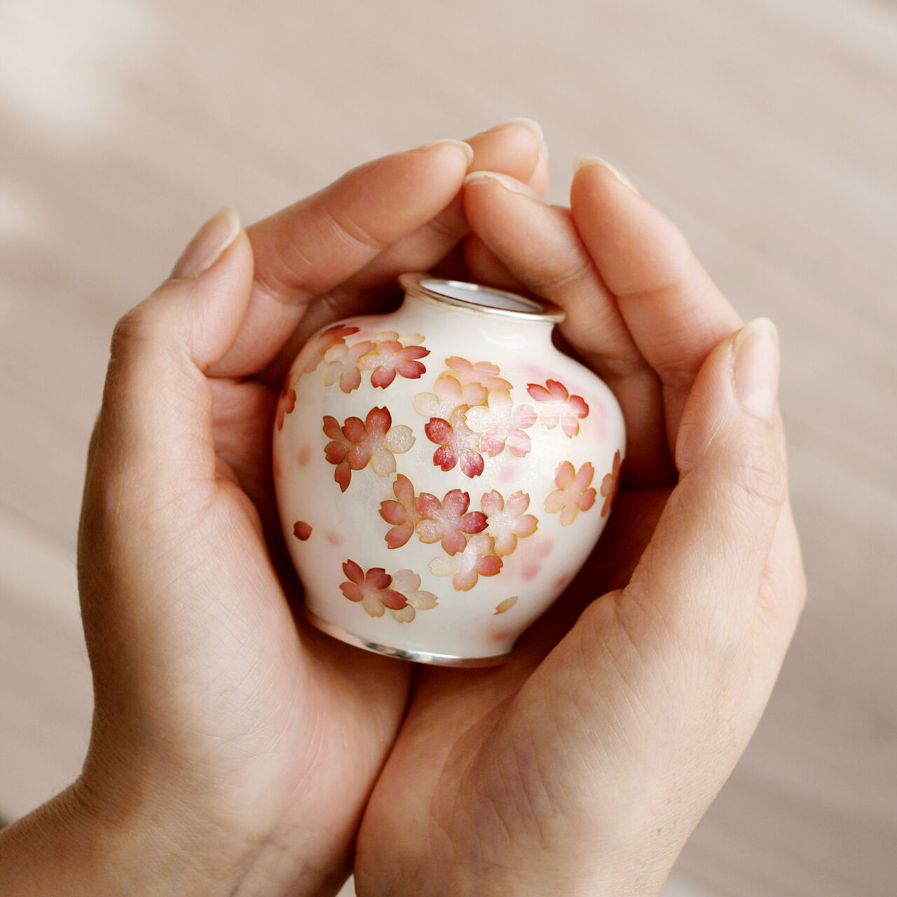 伝統的な桜文様でありながら、尾張七宝らしい透明感と深い色彩を活かしてシンプルに表現しており、愛らしくもモダンな印象もあります。