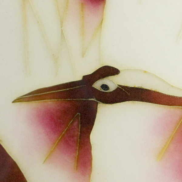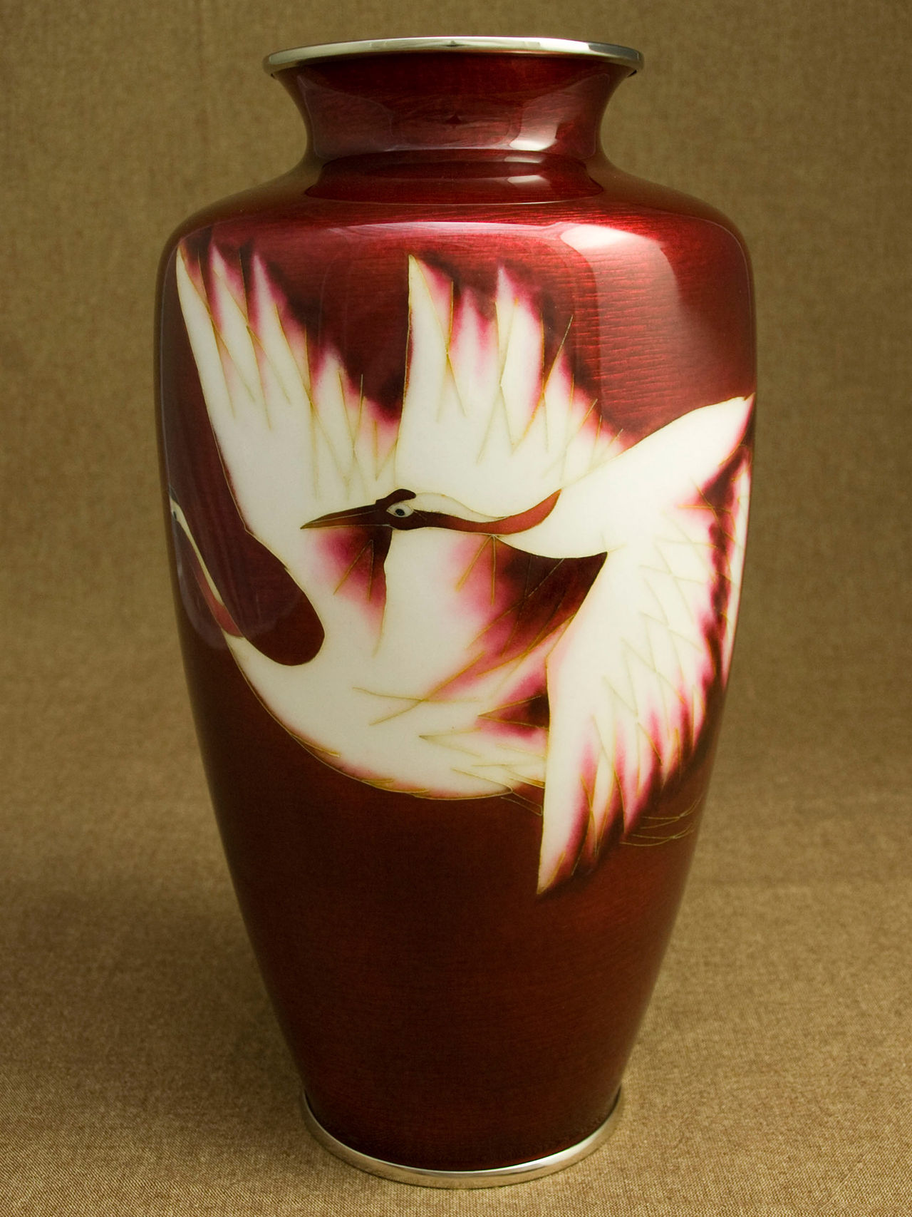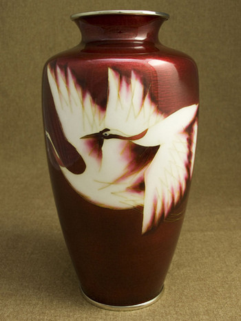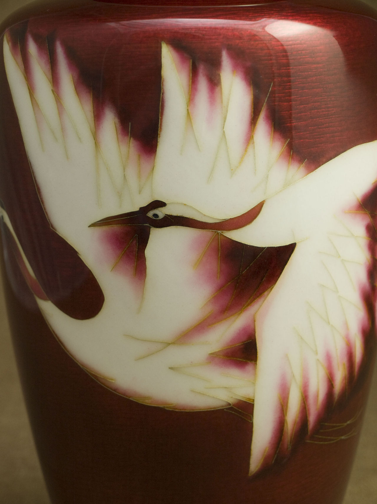 尾張七宝の伝統色「赤透け」の地色に、今にも飛び立っていきそうな躍動感あふれる二羽の鶴をあしらった作品で、本研磨仕上げを施した贅沢な逸品です。