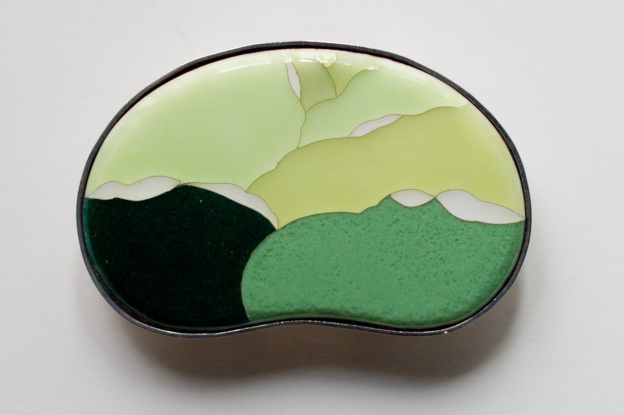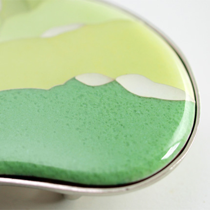 キャベツまるごとの姿を模した、遊び心たっぷりの変わり種。七宝細工らしい透明感をもつ鮮やかな緑色の移り変わりが、シャープに敷かれた銀線によって美しく引き立てられています。