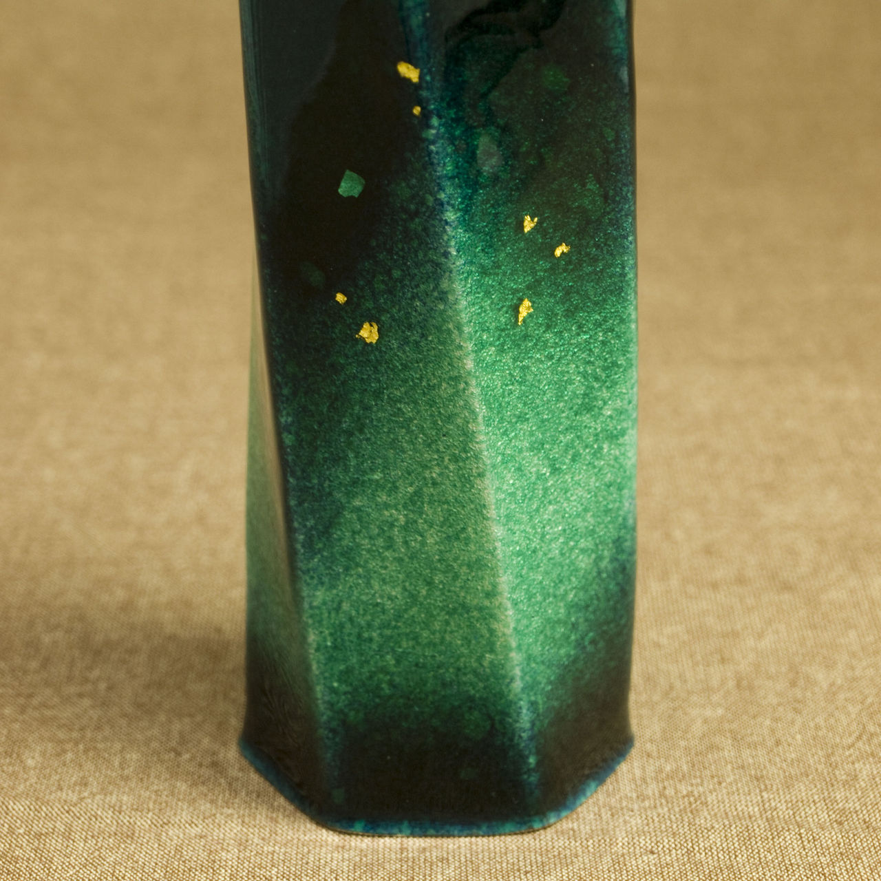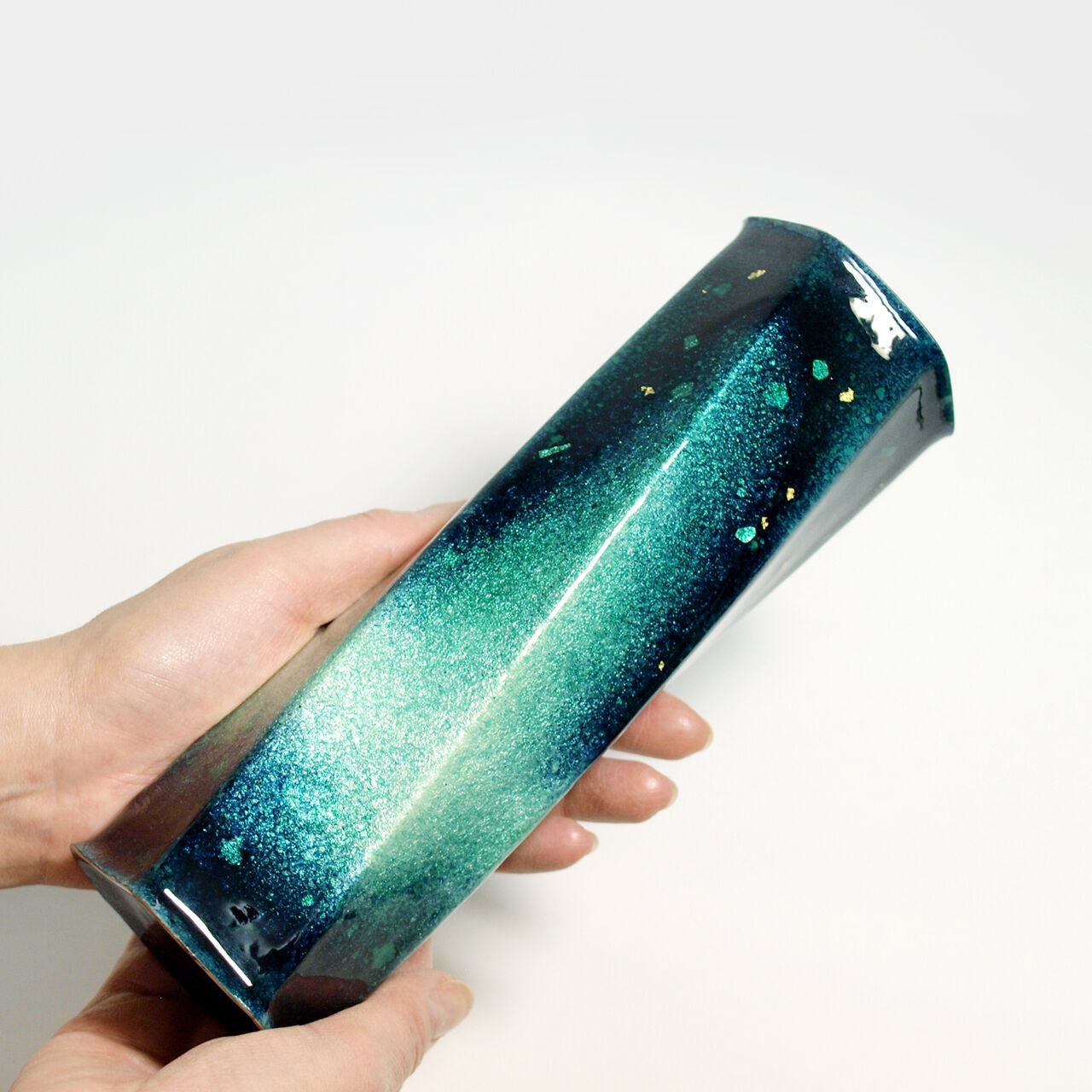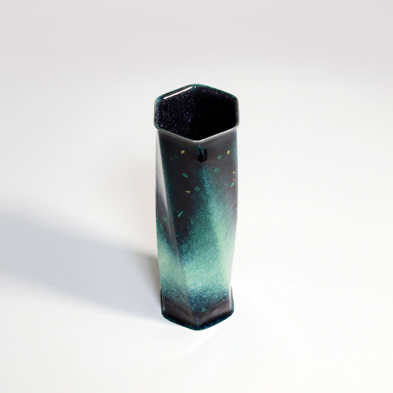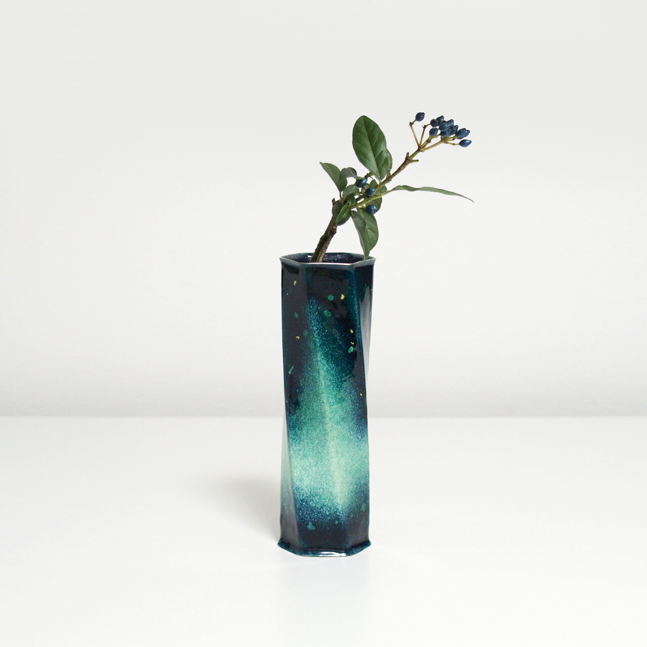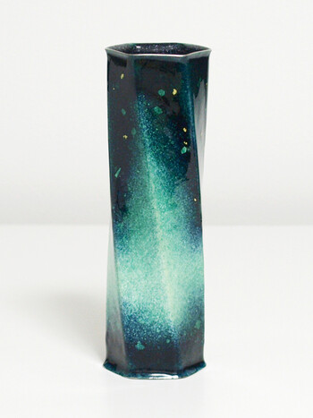 特徴的なねじりの入った六角形をした一輪挿しで、見る角度や光の当たり方などによって様々な美しい表情を見せます。