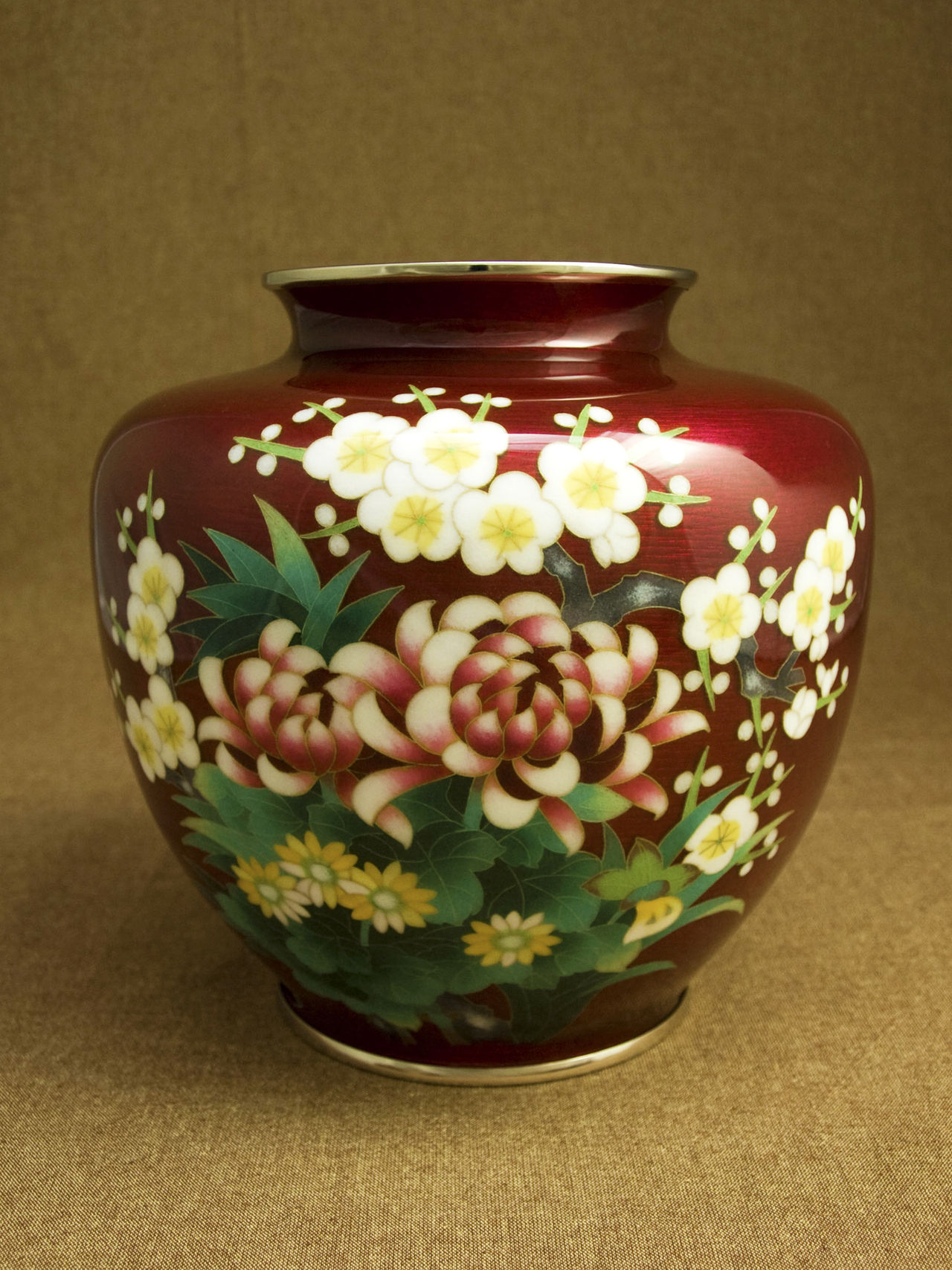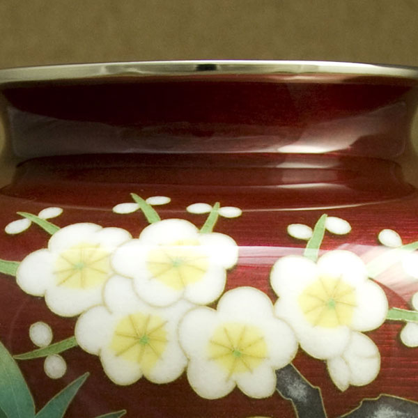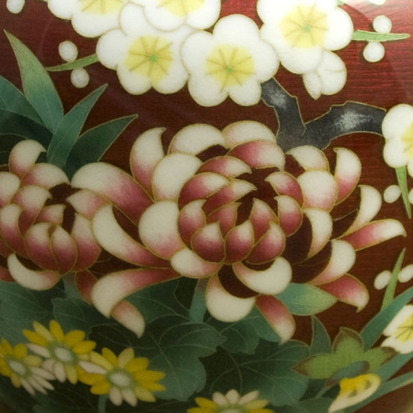大変優雅な作品で、伝統のモチーフを伝統の赤色透明釉(赤透け)と熟練の彩色技術で作り上げた逸品で、尾張七宝を代表する作品の一つです。