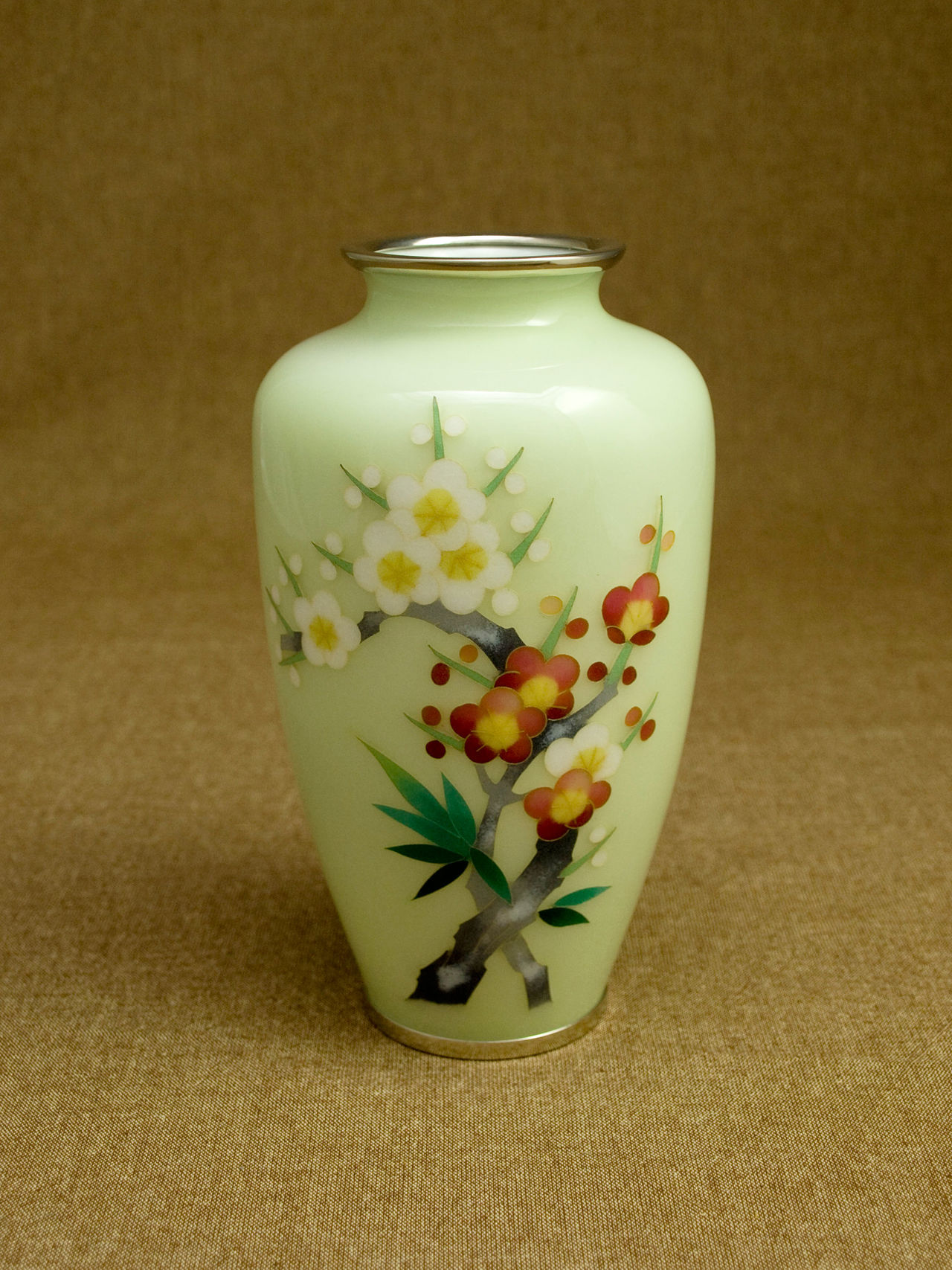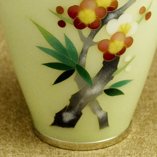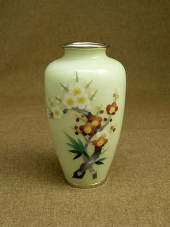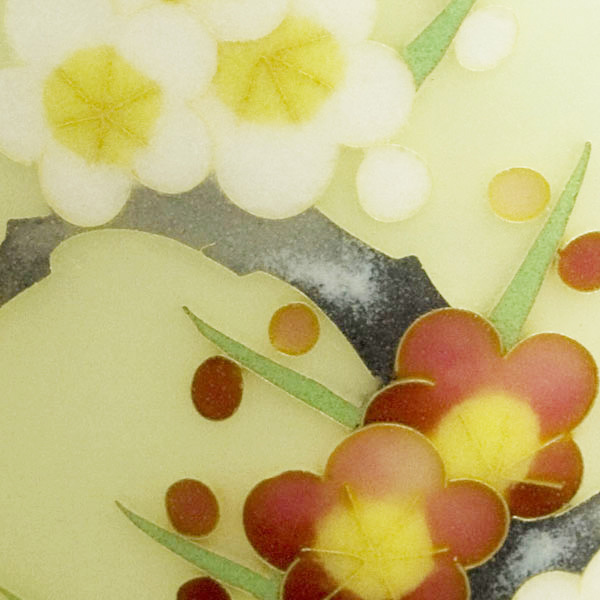 日和色に、紅白の梅が映えた優しい色彩が人気の花瓶です。