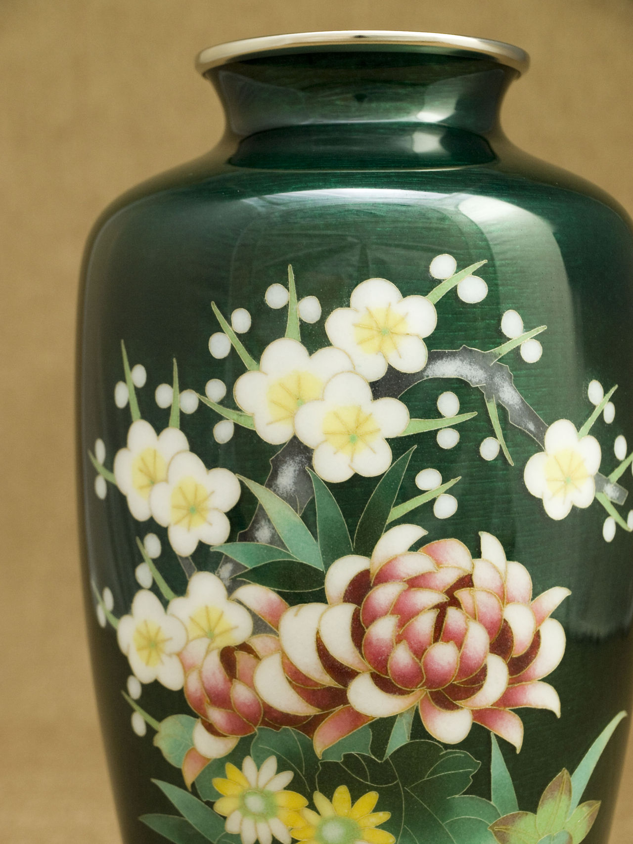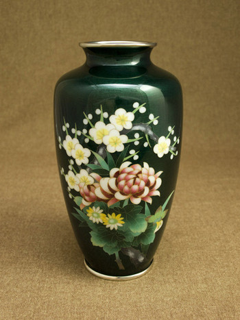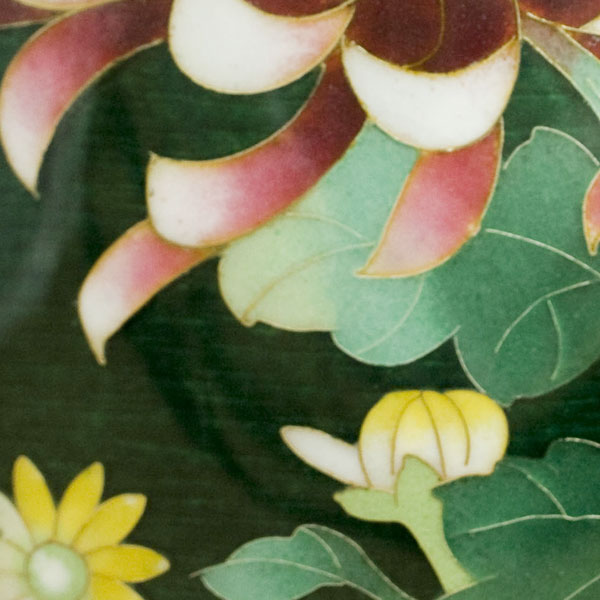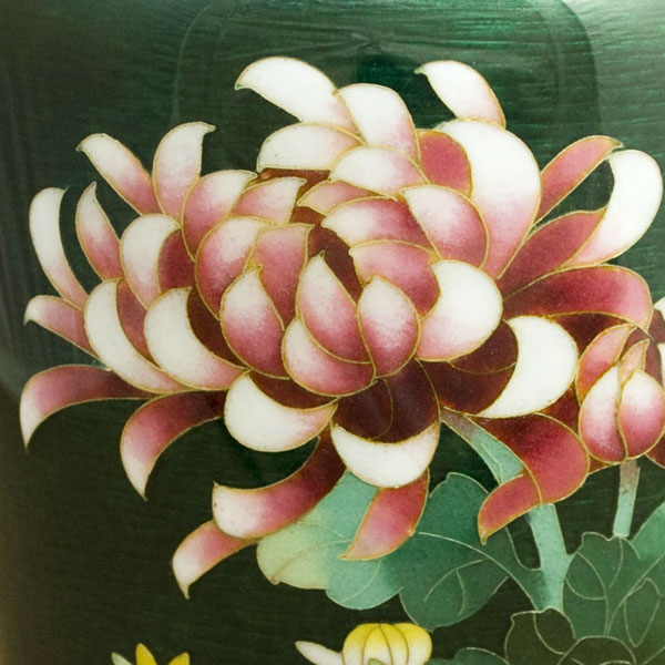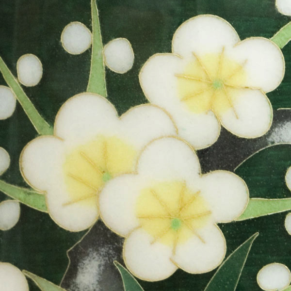 大変優雅な作品で、伝統のモチーフを伝統の緑色透明釉(青透け)と熟練の彩色技術で作り上げた逸品で、尾張七宝を代表する作品の一つです。