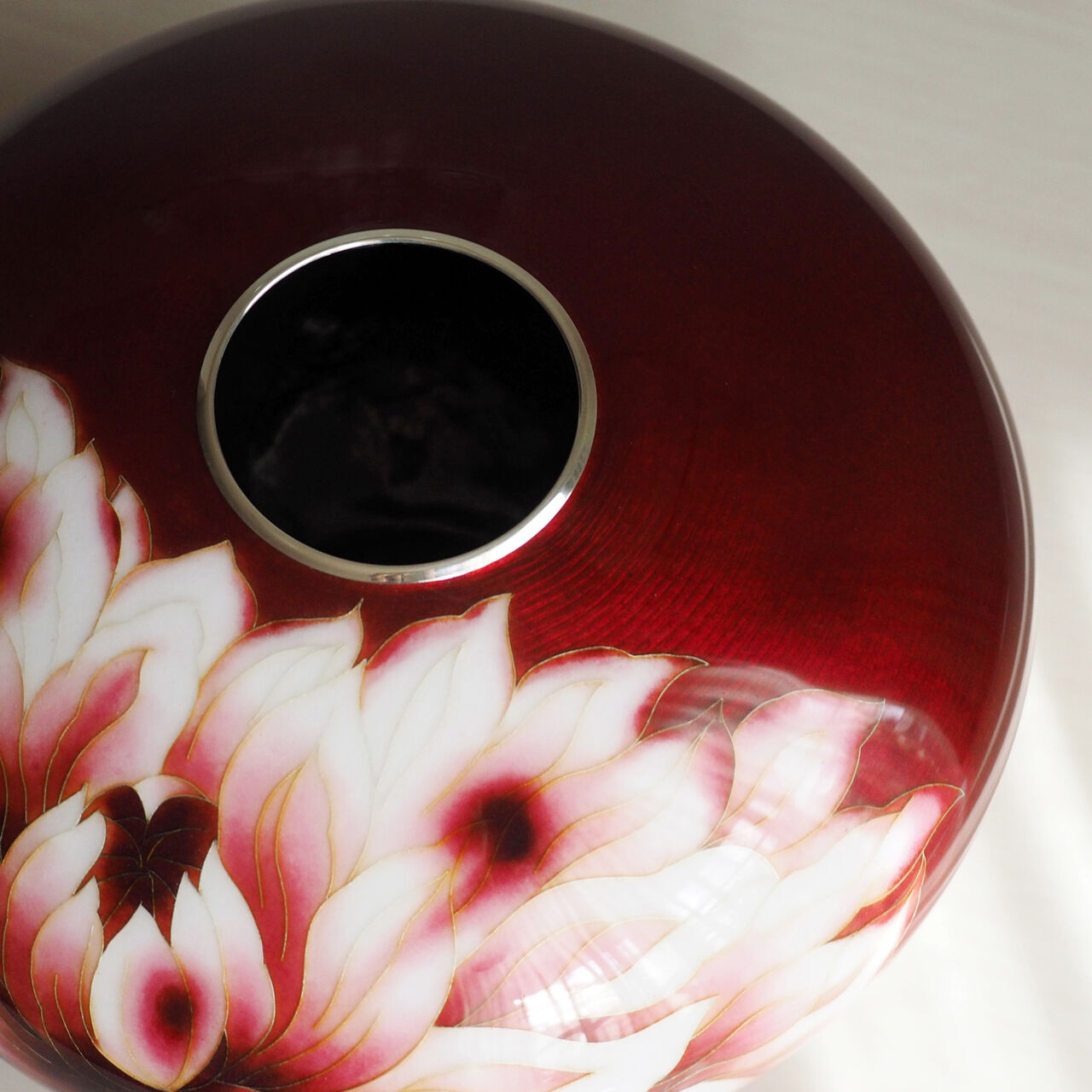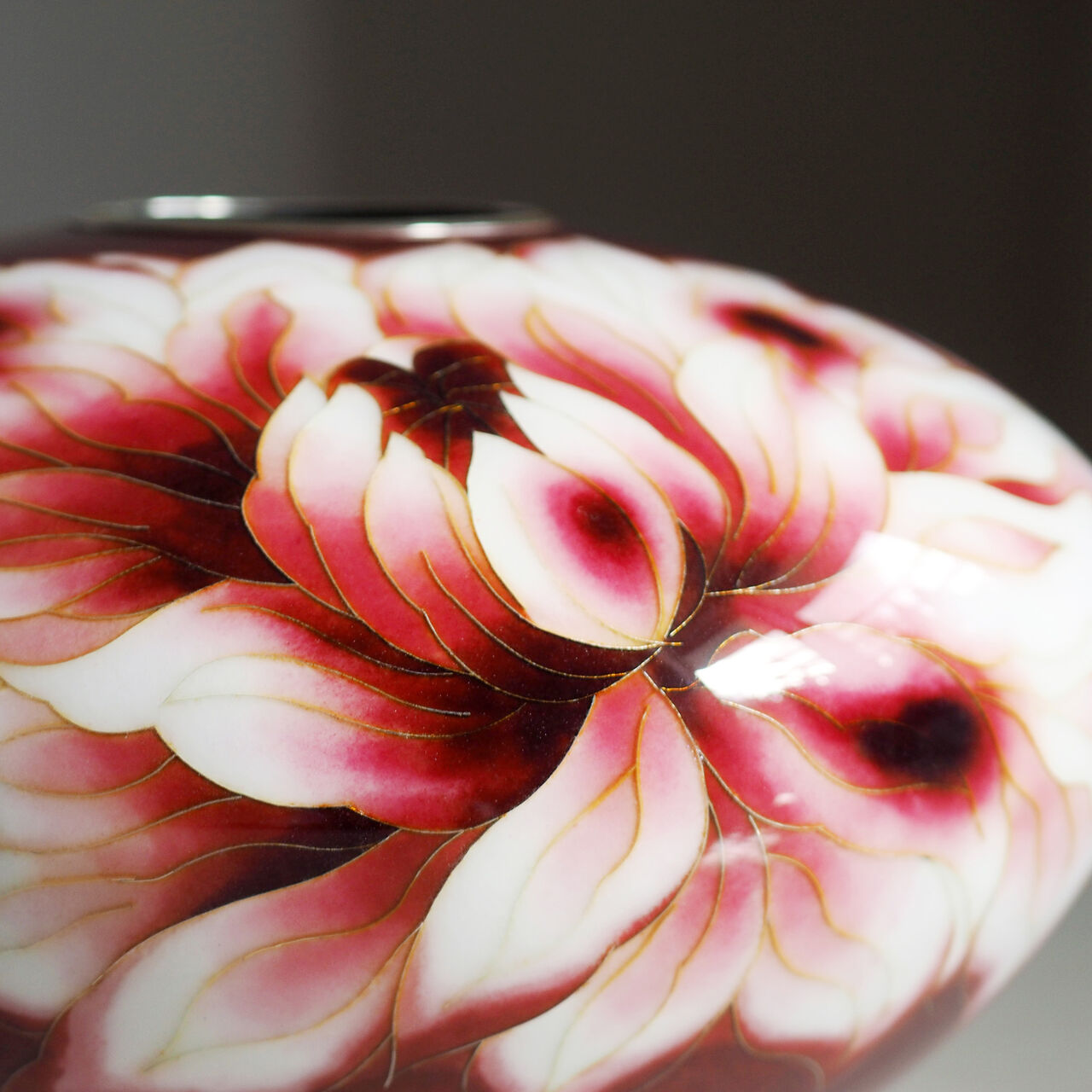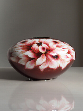 「華麗」「優雅」「威厳」などの花言葉を持つダリアの大輪をゆったりとした花瓶の前面一杯に生き生きと表現し、気品漂う存在感たっぷりの作品です。