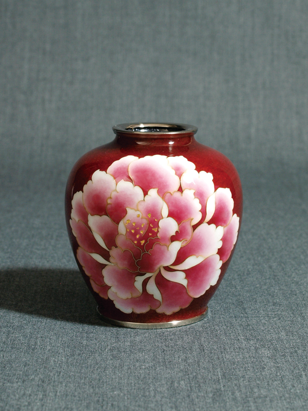 「王者の風格」「高貴」「壮麗」などの花言葉を持つ牡丹の大輪を前面いっぱいに配し、原料の一つに純金を使用することから「金赤」とも呼ばれる赤色透明釉(赤透け)の深い輝きが、豪華絢爛に彩っています。
