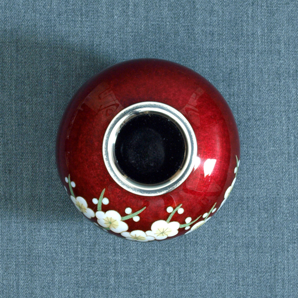 大変優雅な作品で、伝統のモチーフを伝統の赤色透明釉(赤透け)と熟練の彩色技術で作り上げた逸品で、尾張七宝を代表する作品の一つです。