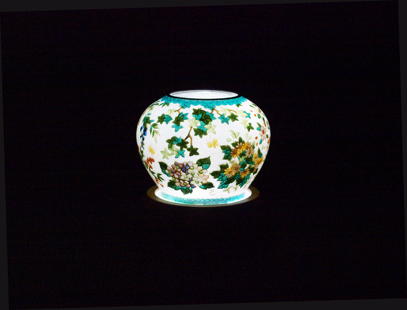 作者は、2年近くの歳月を費やし、植線、彩色、焼成方法、研磨、溶解の仕方など、あらゆる工程に工夫をこらして、その精度を高めることに成功した。専用の照光器も製作し、2つの顔を持つ七宝が完成した。