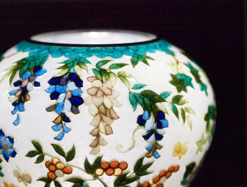 繊細で細密な藤文様をあしらい落ち着きのある色彩でまとめた作品。