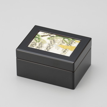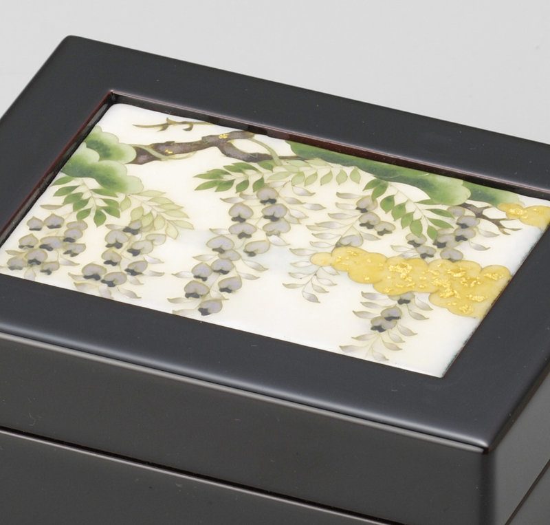 作者が、源氏絵の中でもとりわけ好きな絵柄をモチーフに、大切なジュエリー等を収めるための小箱にアレンジした作品。内側は、別珍仕立てとなっています。